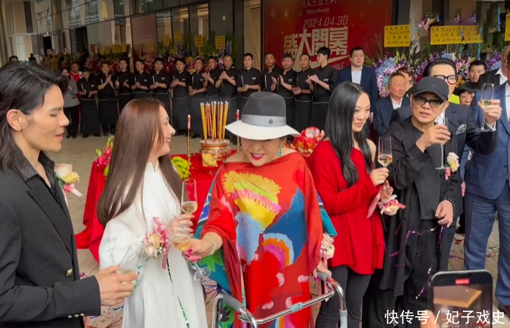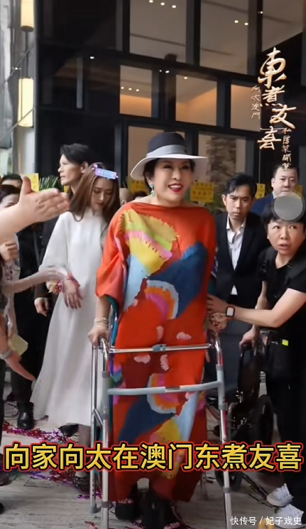 本日的主角向太陈岚固然腿受了伤,也依然扶着撑持亮相。她一稔橘色印花长裙,率领弁冕,浑身金碧光芒雍容富贵,身旁还有专门的东说念主搀扶着。东说念主逢喜事精神爽,向太化着浓妆,笑颜也超越灿烂。