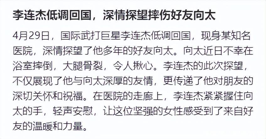 此次向太作念了大腿骨骨折手术,李连杰父女便专门赶赴慰问。