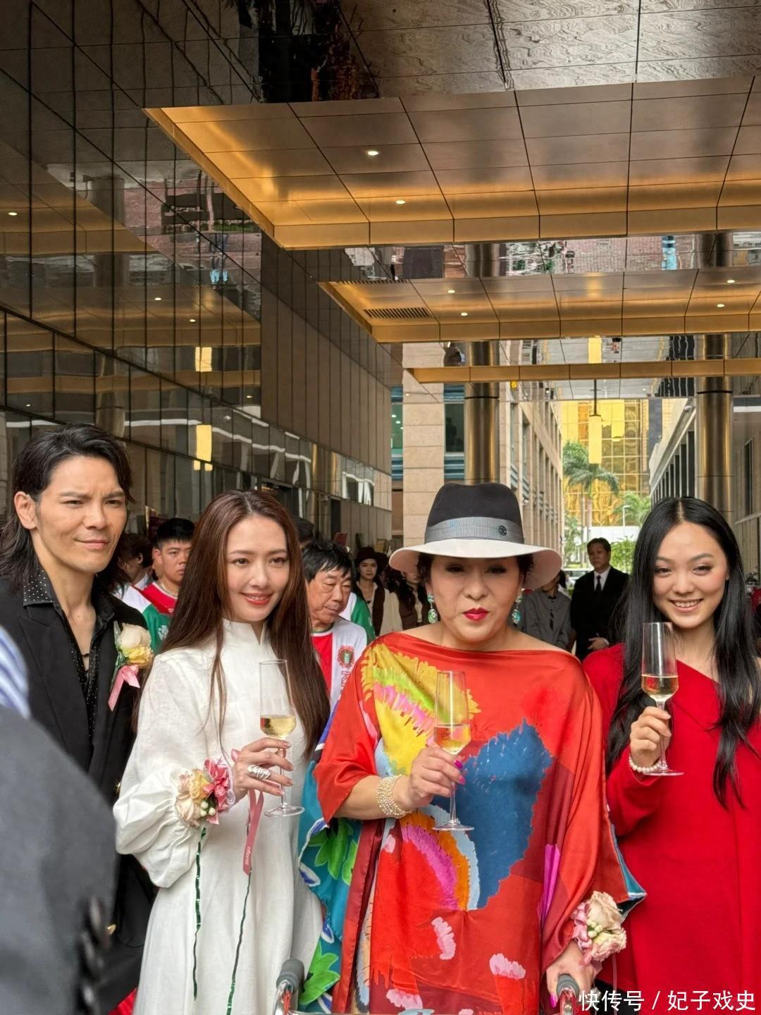 在之后的敬酒轮番,向太亦然先和李连杰父女敬酒,再和向佐郭碧婷举杯。李连杰本日孤苦黑衣黑帽,打扮超越低调;李连杰的男儿反而打扮得超越高调,一稔红色露肩T恤,和向太两东说念主倒有种“母女装”的既视感。