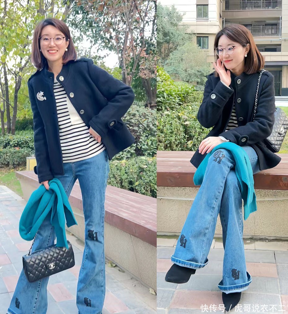 牛仔裤是不少东谈主减龄的第一遴荐,不错当可是然的发挥显嫩遵守,而图中这件长裤还是微喇版型,关于腿部线条也有着显长的作用。其次条纹元素也相通能烘托出更年青的一面,遴荐时不错以瑕瑜双色为先,经典不外时。